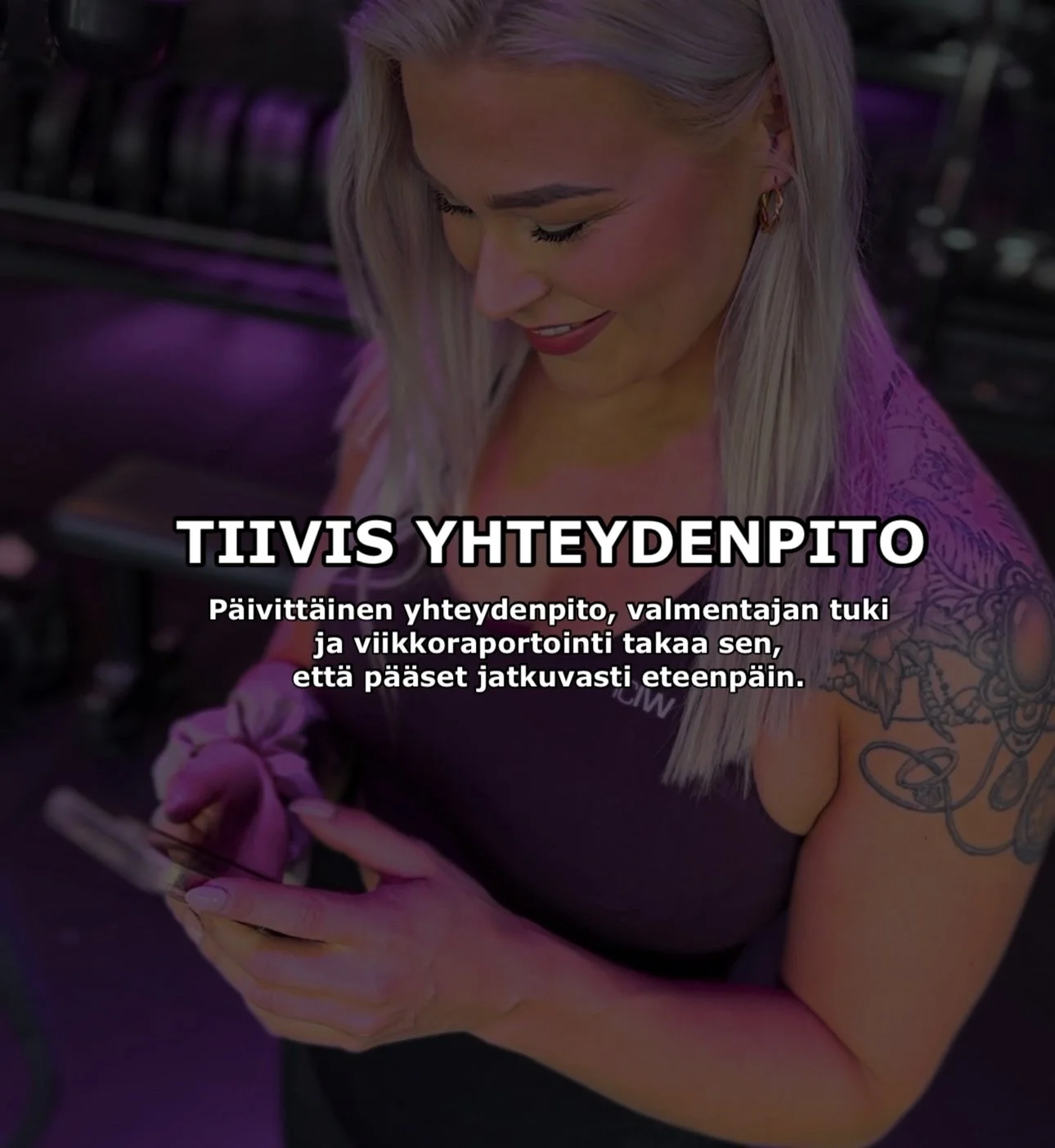 TIIVIS YHTEYDENPITO- Päivittäinen yhteydenpito, valmentajan tuki ja viikkoraportointi takaa sen, että pääset jatkuvasti eteenpäin ja motivaatiosi pysyy korkealla. Tuet oppimaan paljon hyvinvoinnista ja kehittävästä treenistä.